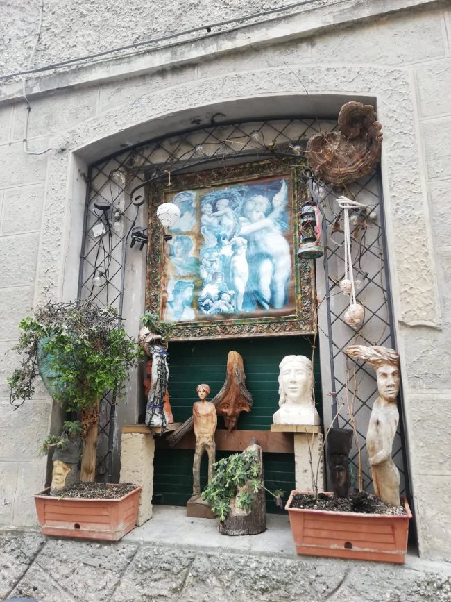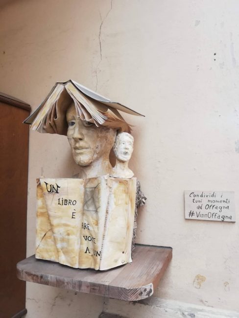 E poi ci sono alcuni angoli più o meno nascosti, lungo i vicoli secondari o nel parco dietro la rocca, dove semplici ritagli di legno o pezzi di pietra prendono vita e diventano simpatici volti, personaggi dalle fattezze sinuose, animali o anche libri.