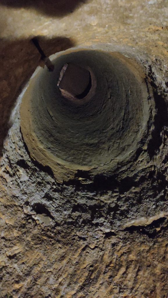 Si vede anche il tunnel di aerazione. Sembra incredibile ma in pochi passi si raggiunge già una profondità di 12 metri perché ci stiamo addentrando verso l’interno del colle Giove.